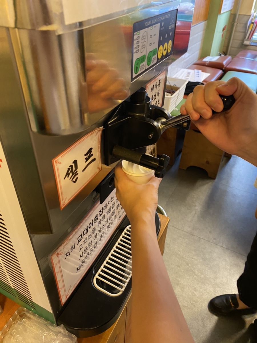 아이스크림 기계 옆에 종이컵이랑 스푼 있으니