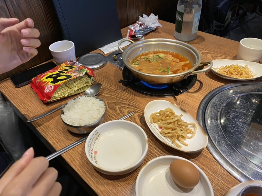 삼겹살 정식 3개에 도시락+라면 먹자고 해서