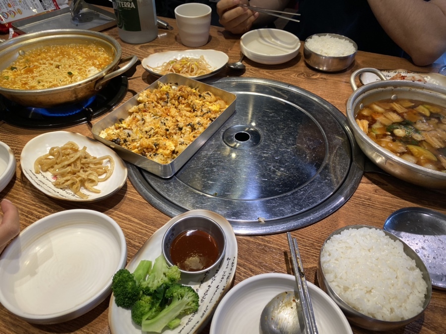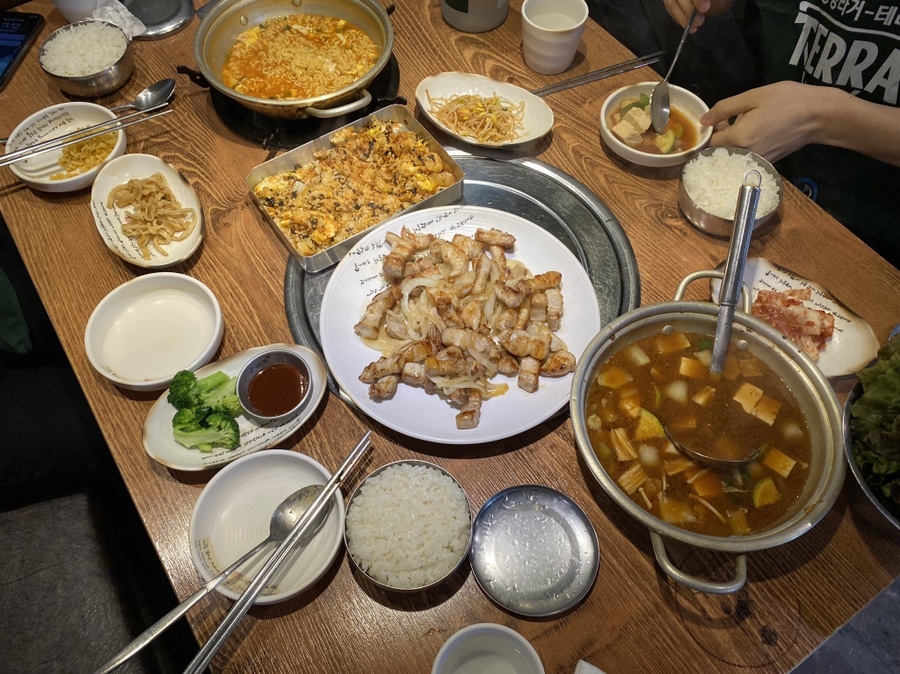 삼겹살 정식 3개에 도시락+라면 먹자고 해서
