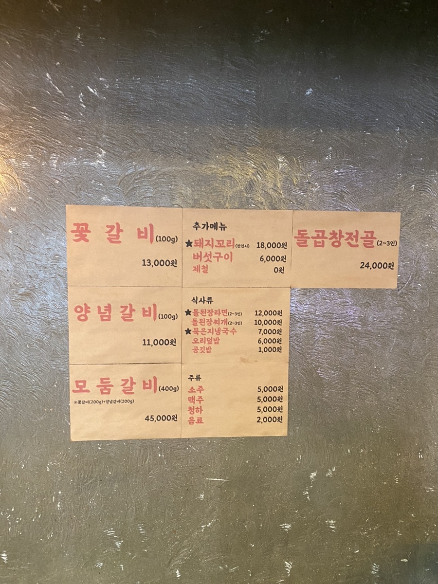 꽃갈비, 양념갈비, 모둠갈비,돌곱창전골