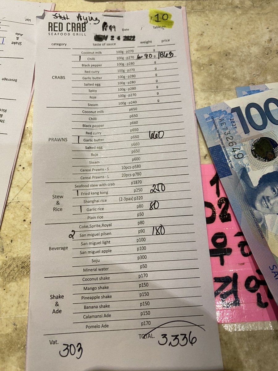 세부 레드크랩 가격은 무려 100g에 270페소인데