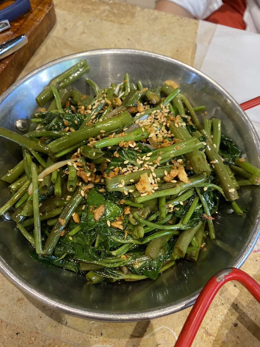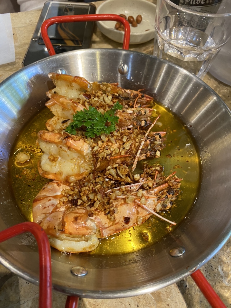 아참 주문은 칠리크랩, 모닝글로리, 새우, 갈릭라이스, 산미구엘!